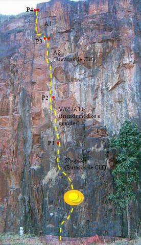 A quarta enfiada é feita em artificial (A1) termina próxima ao cume, onde é possível a saída por ele.